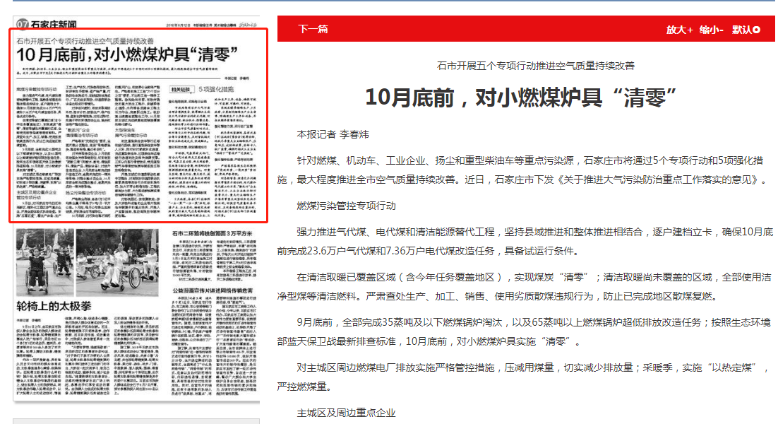 9月底前,全部完成35蒸吨及以下燃煤锅炉淘汰,以及65蒸吨以上燃煤锅炉超低排放改造任务;按照生态环境部蓝天保卫战最新排查标准,10月底前,对小燃煤炉具实施“清零”。
