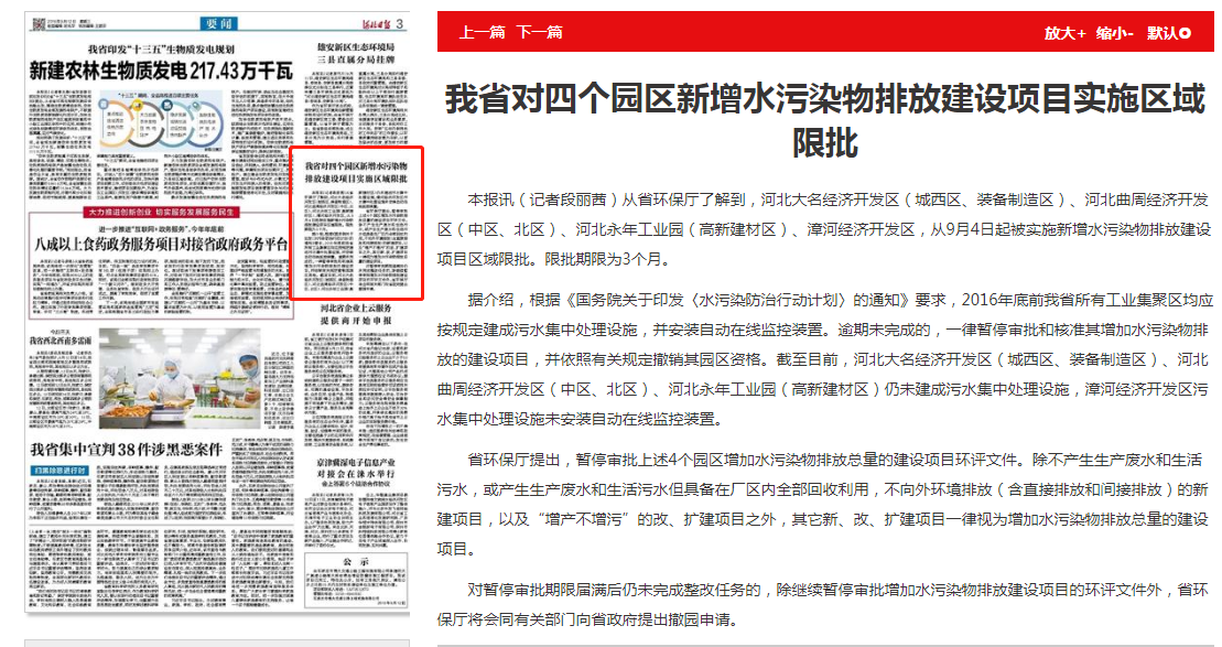 河北日报:我省对四个园区新增水污染物排放建设项目实施区域限批
