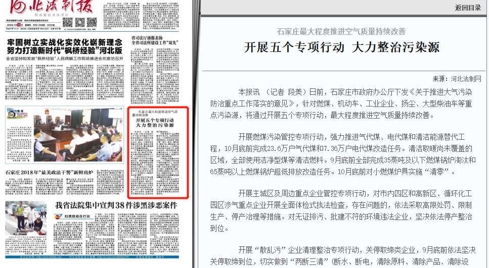 本报讯 (记者 段美)日前,石家庄市政府办公厅下发《关于推进大气污染防治重点工作落实的意见》,针对燃煤、机动车、工业企业、扬尘、大型柴油车等重点污染源,将通过开展五个专项行动,最大程度推进空气质量持续改善。
