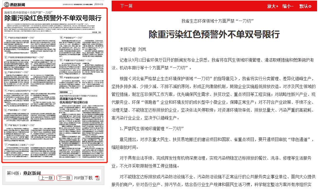 燕赵都市报:我省生态环保领域十方面严禁“一刀切” 除重污染红色预警外不单双号限行