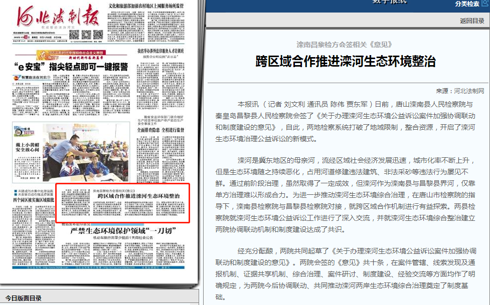 经充分酝酿,两院共同起草了《关于办理滦河生态环境公益诉讼案件加强协调联动和制度建设的意见》。两院会签的《意见》共十条,在案件管辖、线索发现及通报机制、证据共享机制、综合治理、案件研讨、制度建设、经验交流等方面均作了明确规定,为两院今后协调联动、共同推动滦河两岸生态环境综合治理奠定了制度基础。