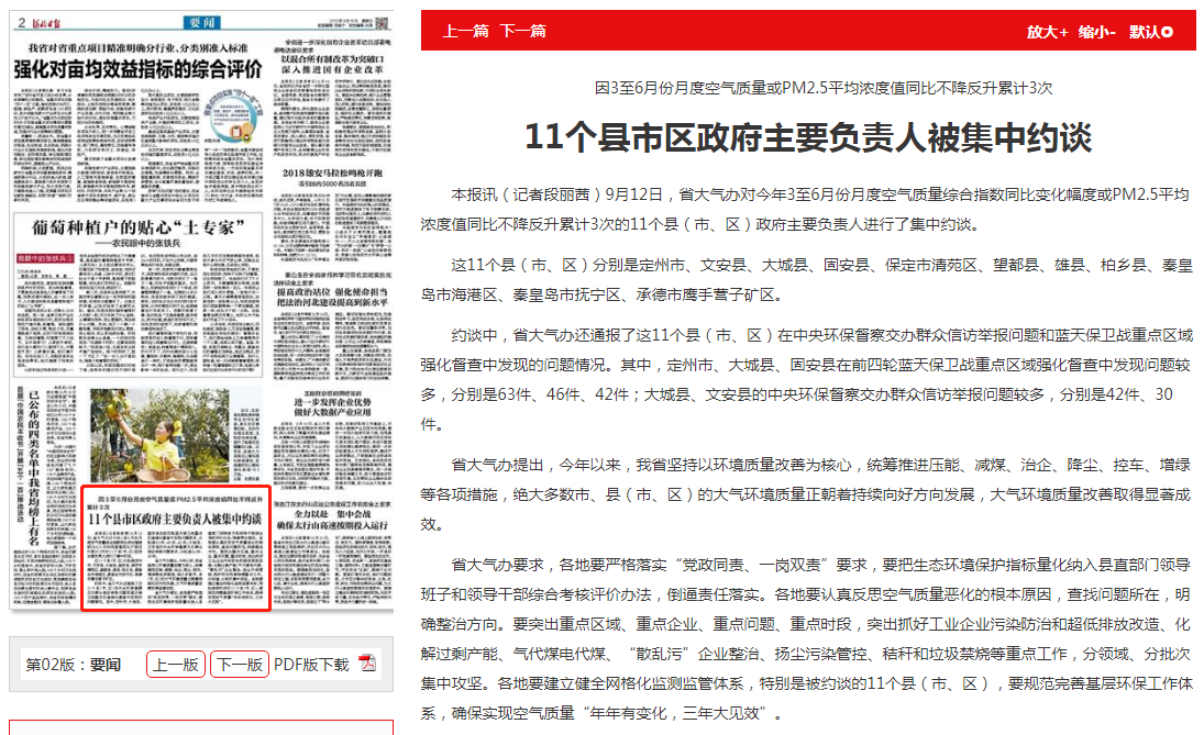 约谈中,省大气办还通报了这11个县(市、区)在中央环保督察交办群众信访举报问题和蓝天保卫战重点区域强化督查中发现的问题情况。其中,定州市、大城县、固安县在前四轮蓝天保卫战重点区域强化督查中发现问题较多,分别是63件、46件、42件;大城县、文安县的中央环保督察交办群众信访举报问题较多,分别是42件、30件。