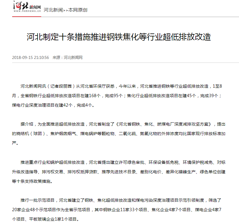 河北新闻网:河北制定十条措施推进钢铁焦化等行业超低排放改造