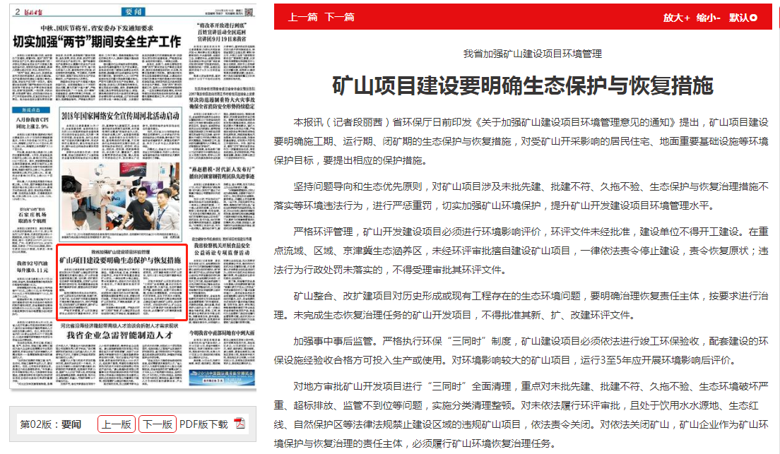 河北日报: 我省加强矿山建设项目环境管理 矿山项目建设要明确生态保护与恢复措施