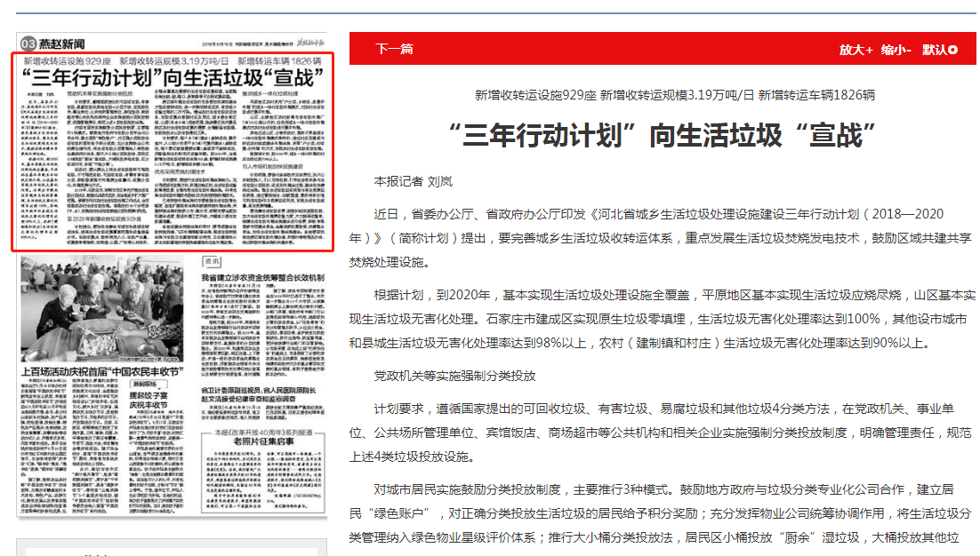 近日,省委办公厅、省政府办公厅印发《河北省城乡生活垃圾处理设施建设三年行动计划(2018—2020年)》(简称计划)提出,要完善城乡生活垃圾收转运体系,重点发展生活垃圾焚烧发电技术,鼓励区域共建共享焚烧处理设施。