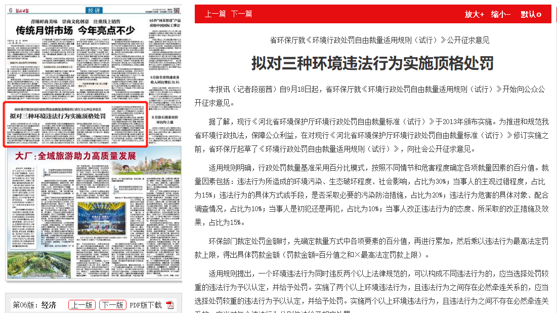 河北日报:省环保厅就《环境行政处罚自由裁量适用规则(试行)》公开征求意见 拟对三种环境违法行为实施顶格处罚