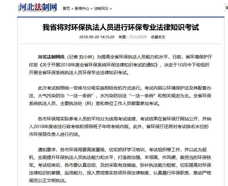 河北法制网讯(记者 刘小林)为提高全省环保执法人员能力和水平,日前,省环境保护厅印发《关于开展2018年度全省环保系统环保法律知识考试的通知》,决定于10月中下旬组织开展全省环保系统执法人员环保专业法律知识考试。