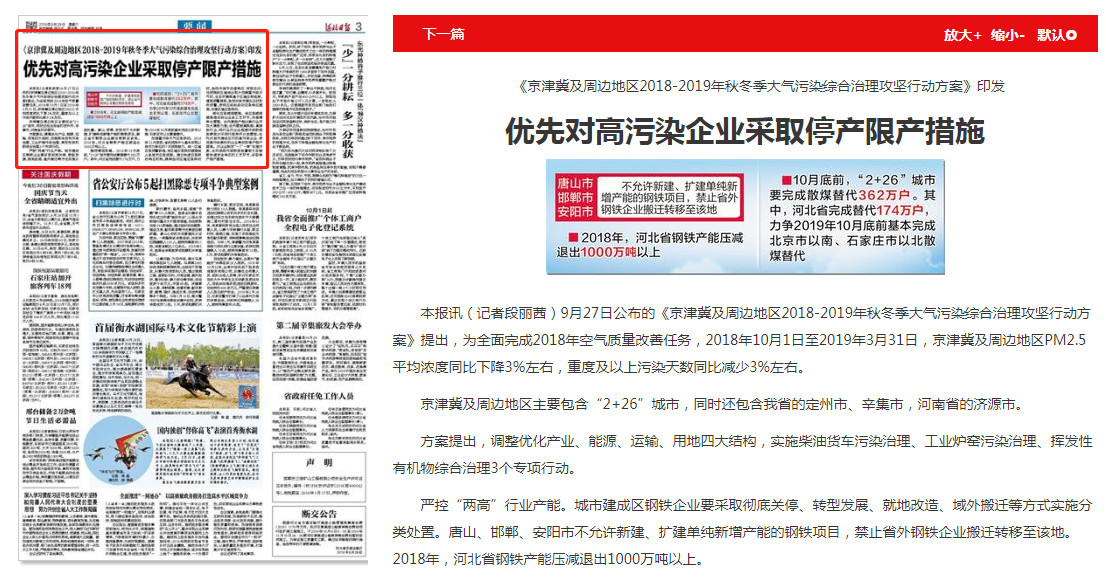 严控“两高”行业产能。城市建成区钢铁企业要采取彻底关停、转型发展、就地改造、域外搬迁等方式实施分类处置。唐山、邯郸、安阳市不允许新建、扩建单纯新增产能的钢铁项目,禁止省外钢铁企业搬迁转移至该地。2018年,河北省钢铁产能压减退出1000万吨以上。