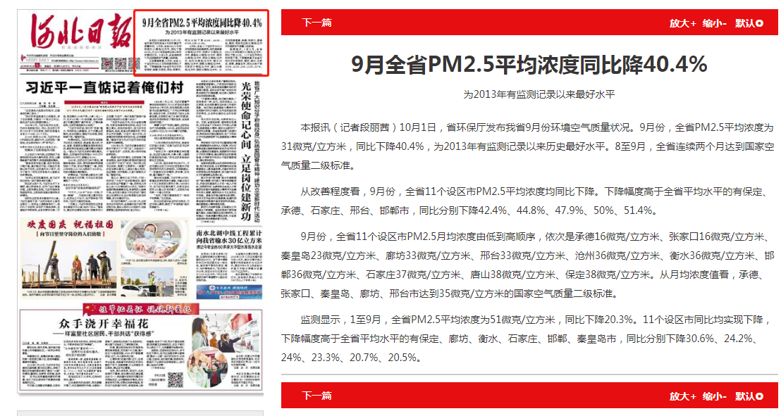 河北日报:9月全省PM2.5平均浓度同比降40.4%