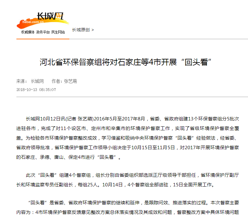 长城网:河北省环保督察组将对石家庄等4市开展“回头看”