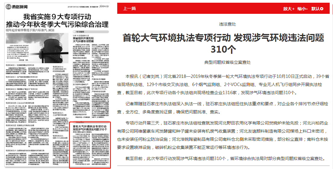 燕赵都市报: 违法查处 首轮大气环境执法专项行动 发现涉气环境违法问题310个