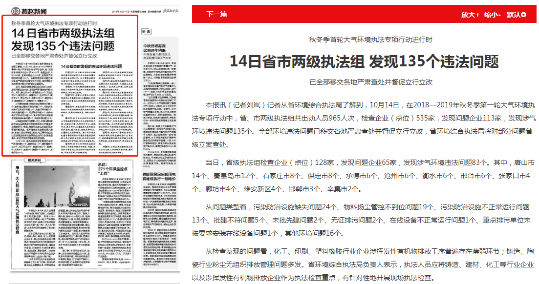 燕赵都市报:#秋冬季首轮大气环境执法专项行动进行时#14日省市两级执法组 发现135个违法问题