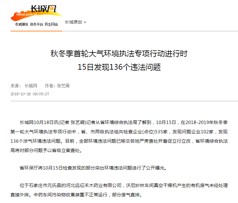 长城网:秋冬季首轮大气环境执法专项行动进行时 15日发现136个违法问题