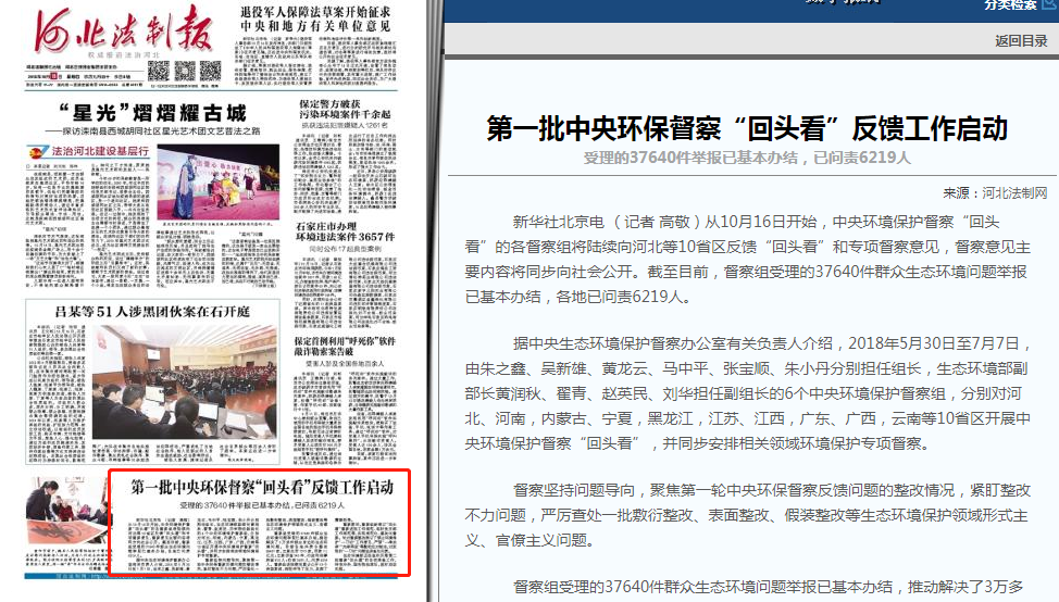 新华社北京电 (记者 高敬)从10月16日开始,中央环境保护督察“回头看”的各督察组将陆续向河北等10省区反馈“回头看”和专项督察意见,督察意见主要内容将同步向社会公开。截至目前,督察组受理的37640件群众生态环境问题举报已基本办结,各地已问责6219人。