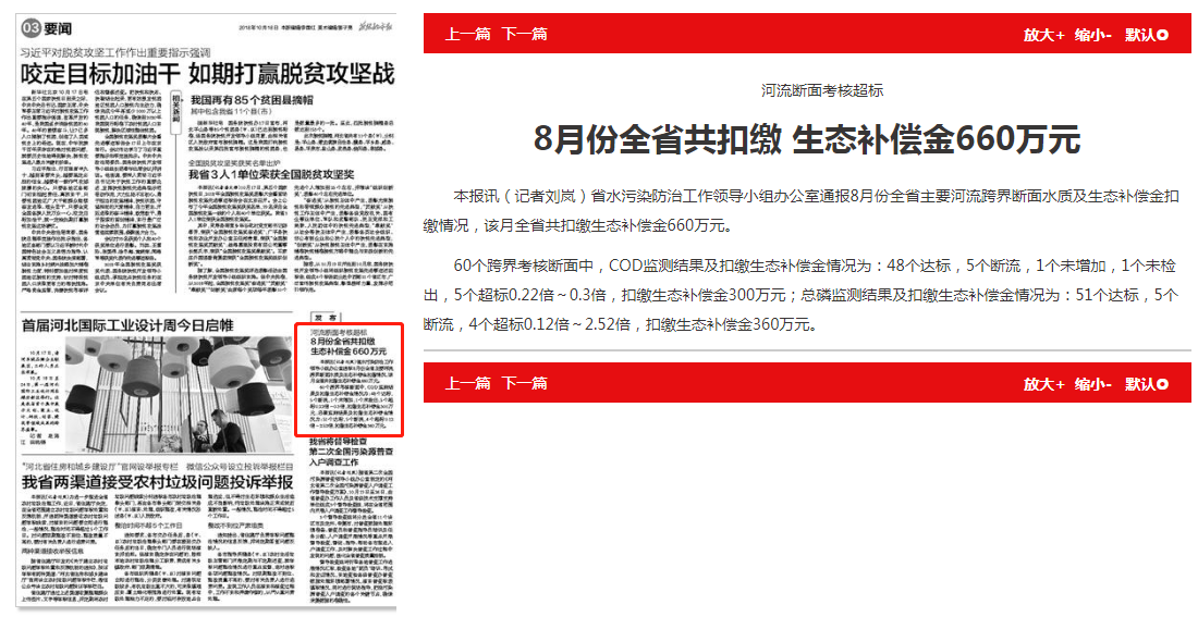燕赵都市报: 河流断面考核超标 8月份全省共扣缴 生态补偿金660万元 来源:省生态环境宣传教育中心 时间:2018-10-18