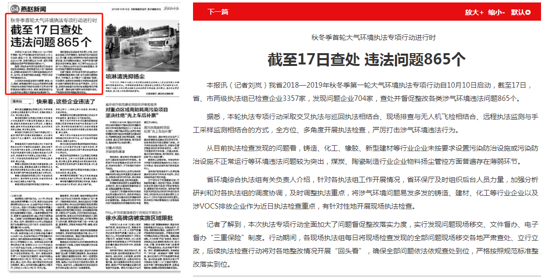 本报讯(记者刘岚)我省2018—2019年秋冬季第一轮大气环境执法专项行动自10月10日启动,截至17日,省、市两级执法组已检查企业3357家,发现问题企业704家,查处并督促整改各类涉气环境违法问题865个。