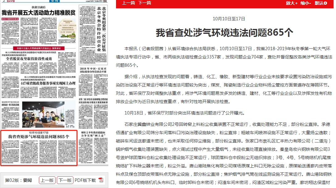 石家庄冀鑫锌业有限公司2号回转窑上料粉尘收集装置不正常运行,收集处理能力不足,部分粉尘直排。承德佰通矿业有限公司筛分车间落料口污染治理设施缺失,粉尘直排;粗破车间喷淋设施不正常运行,大量扬尘逸散;破碎车间运送廊道未密闭,也未采取任何抑尘措施,部分粉尘直排。张家口市崇礼区汇丰热力有限公司(二道沟)锅炉烟气收集处理装置缺失,点火调试过程中产生大量烟气,未经收集处理直接排放。秦皇岛宏兴钢铁有限公司3号竖炉球团落料仓粉尘收集处理设施不正常运行,球团落料仓中段粉尘无组织排放;3号、4号、5号烧结机机尾推烧结矿下料除尘器未密闭,粉尘外溢。唐山港陆焦化有限公司煤场原煤上料口无除尘设施,原煤输送通廊内皮带落料点及煤仓顶部皮带落料点无除尘设施,部分粉尘直排;焦炉烟气排气筒在线监测设施不正常运行。唐山港陆钢铁有限公司6号烧结机机头布料口、临时卸料仓未密闭;闷渣车间未密闭,闷渣区域粉尘污染严重。廊坊翔达保温材料有限公司原料场、一车间上料口和二车间上料口未密闭,部分粉尘无组织排放。高碑店市亚腾达橡塑有限公司违反环评批复要求,擅自增设4台平板硫化机。位于河间市的河北康洁家居制品有限公司第四喷漆车间废气处理设施不正常运行,部分挥发性有机物未经处理直接排放;抛光工序未按要求安装粉尘收集处理装置,粉尘直排。位于临城县的河北华邦生物科技有限公司无排污许可证,生产设备有明显使用痕迹,涉嫌无证排污。河北新武安钢铁集团烘熔钢铁有限公司1260立方米高炉西出铁口渣沟未密闭,部分烟粉尘直排;烧结机头排气筒在线监测设施不正常运行。武安市宝烨煤焦化工业有限公司精煤料棚未密闭,上料口未安装粉尘收集处理设施,部分粉尘直排;酚氰废水处理设施未密闭,未安装挥发性有机废气收集处理设施,挥发性有机物直排。定州市北盛汽车零部件有限公司抛丸车间未密闭,粉尘直排。辛集市宏顺制革厂吸尘引风机管道破裂,污染防治设施不正常运行,部分粉尘直排。辛集市鑫熙皮革有限公司转鼓、拌鼓污染防治设施不正常运行,粉尘污染严重。