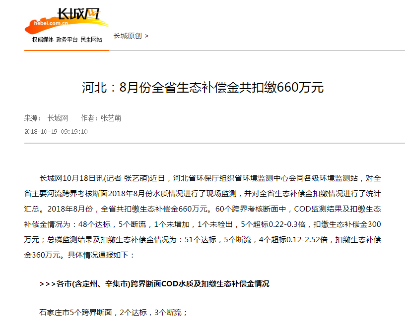 衡水市5个跨界断面,4个达标,1个超标2.52倍,扣缴生态补偿金180万元;
