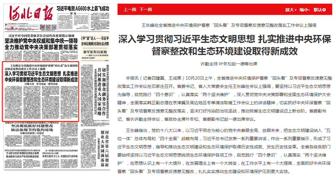 河北日报:深入学习贯彻习近平生态文明思想 扎实推进中央环保督察整改和生态环境建设取得新成效