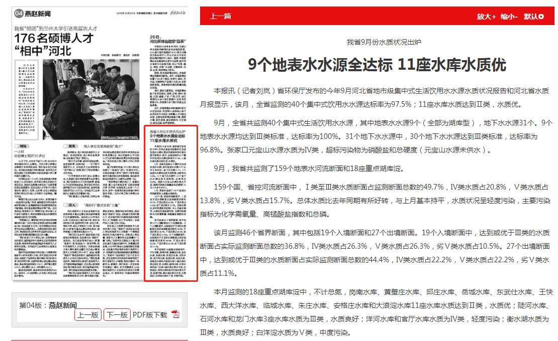 燕赵都市报:我省9月份水质状况出炉 9个地表水水源全达标 11座水库水质优