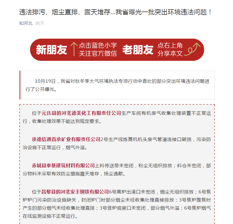 10月19日,我省对秋冬季大气环境执法专项行动中查处的部分突出环境违法问题进行了公开曝光。