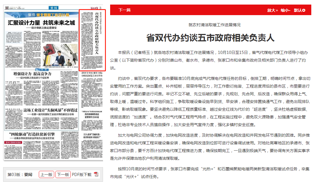 河北日报: 就农村清洁取暖工作进展情况 省双代办约谈五市政府相关负责人