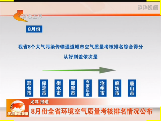 河北卫视《河北新闻联播》:8月份全省环境空气质量考核排名情况公布