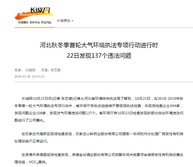 长城网:河北秋冬季首轮大气环境执法专项行动进行时 22日发现137个违法问题