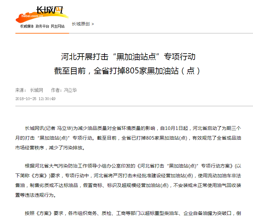 长城网:河北开展打击“黑加油站点”专项行动 截至目前,全省打掉805家黑加油站(点)
