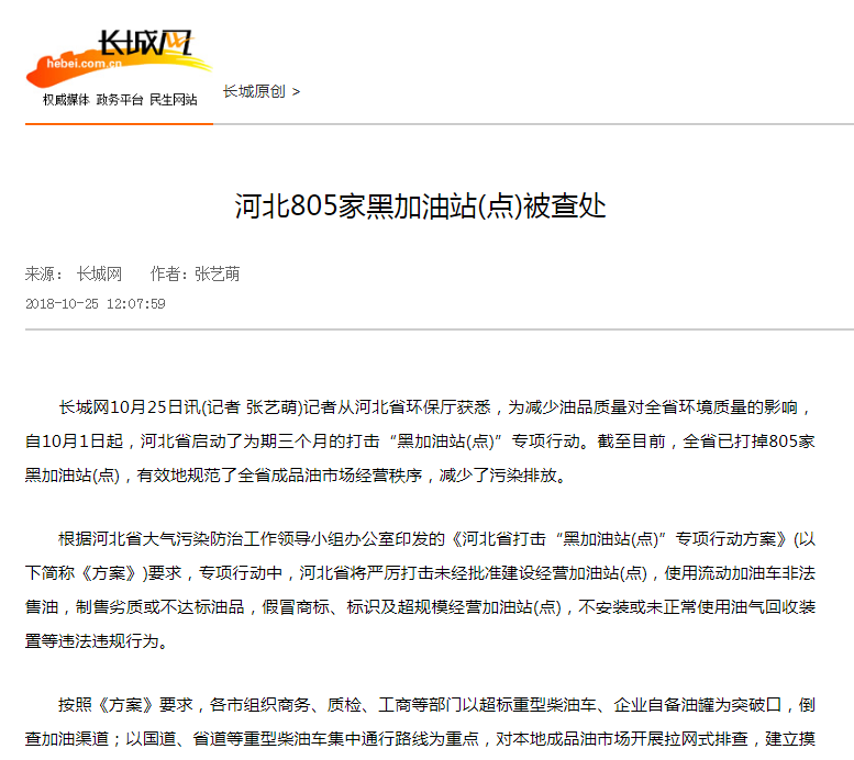 根据河北省大气污染防治工作领导小组办公室印发的《河北省打击“黑加油站(点)”专项行动方案》(以下简称《方案》)要求,专项行动中,河北省将严厉打击未经批准建设经营加油站(点),使用流动加油车非法售油,制售劣质或不达标油品,假冒商标、标识及超规模经营加油站(点),不安装或未正常使用油气回收装置等违法违规行为。