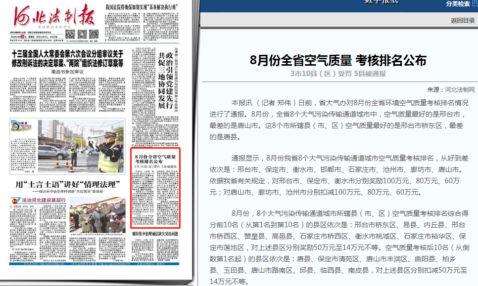 8月份,8个大气污染传输通道城市所辖县(市、区)空气质量考核排名综合得分前10名(从第1名到第10名)的县区依次是:邢台市桥东区、易县、内丘县、邢台市桥西区、赞皇县、高邑县、石家庄市桥西区、衡水市桃城区、石家庄市裕华区、保定市莲池区,对上述县区分别奖励50万元至14万元不等。空气质量考核后10名(从倒数第1名起)的县区依次是:唐县、保定市清苑区、唐山市丰润区、曲阳县、柏乡县、玉田县、唐山市路南区、邱县、临西县、南皮县,对上述县区分别扣减50万元至14万元不等。
