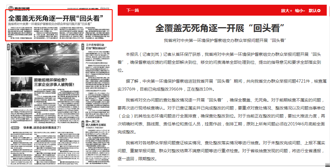 我省将对交办问题的查处整改情况逐一开展“回头看”,确保全覆盖、无死角。对于前期核查不属实的问题,要再次进行现场核查确认。对于已查证属实并已完成整改的问题,要重点对查处情况、整改情况以及问题当事单位(企业)的其他生态环境问题进行全面排查,确保查处整改到位。对于当前正在整改的问题,要加大推进力度,再次明确时间表、路线图、责任单位和责任人员,挂图作战,倒排工期,原则上所有问题必须在2019年6月底前全面完成整改。