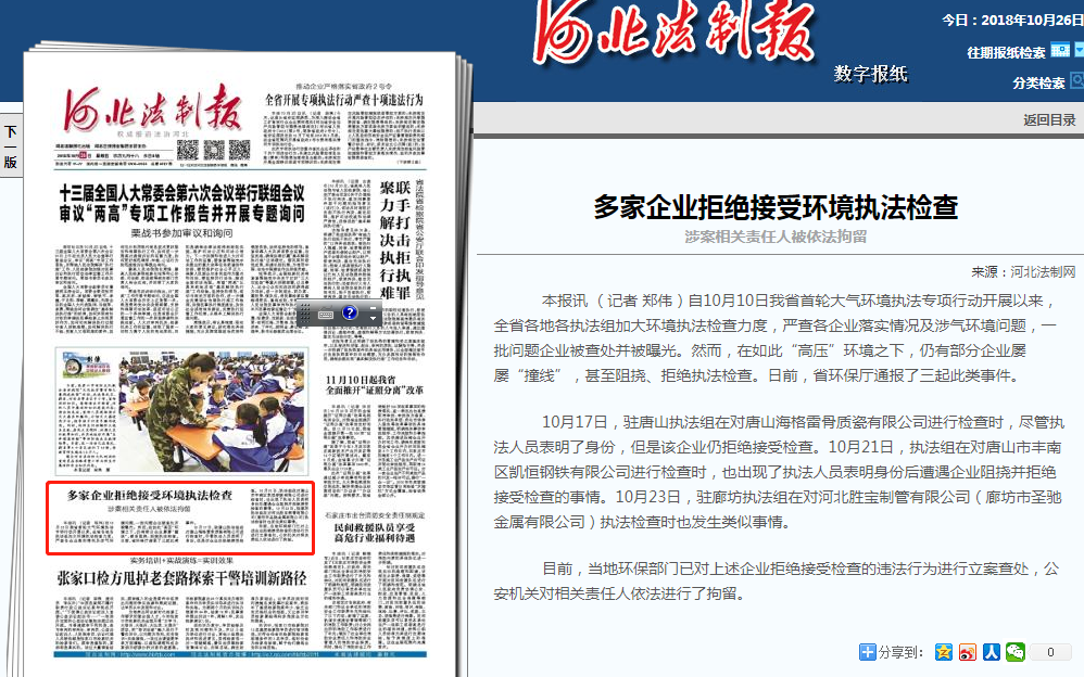 河北法制报:多家企业拒绝接受环境执法检查 涉案相关责任人被依法拘留