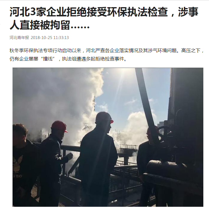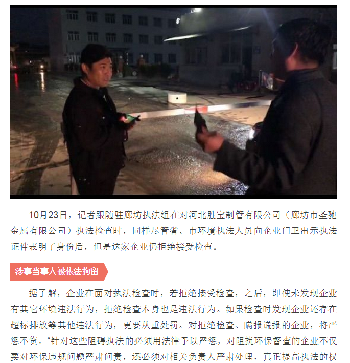 河北青年报:河北3家企业拒绝接受环保执法检查,涉事人直接被拘留……