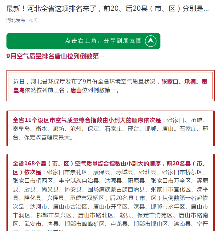 河北发布微信:最新!河北全省这项排名来了,前20、后20县(市、区)分别是…