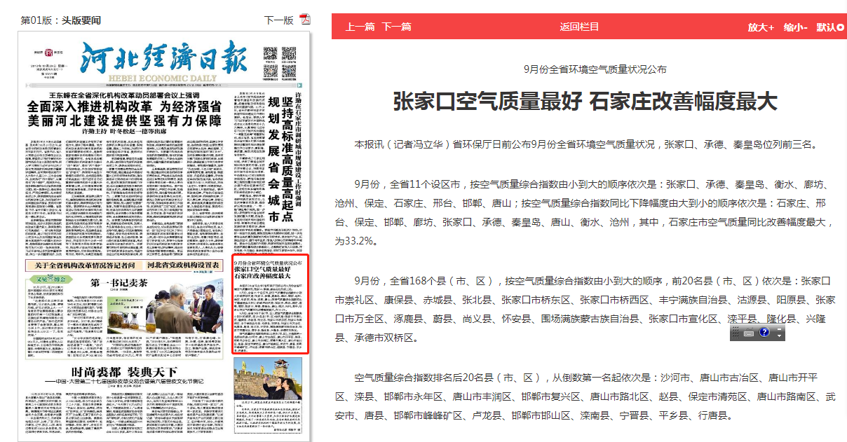河北经济日报: 9月份全省环境空气质量状况公布 张家口空气质量最好 石家庄改善幅度最大
