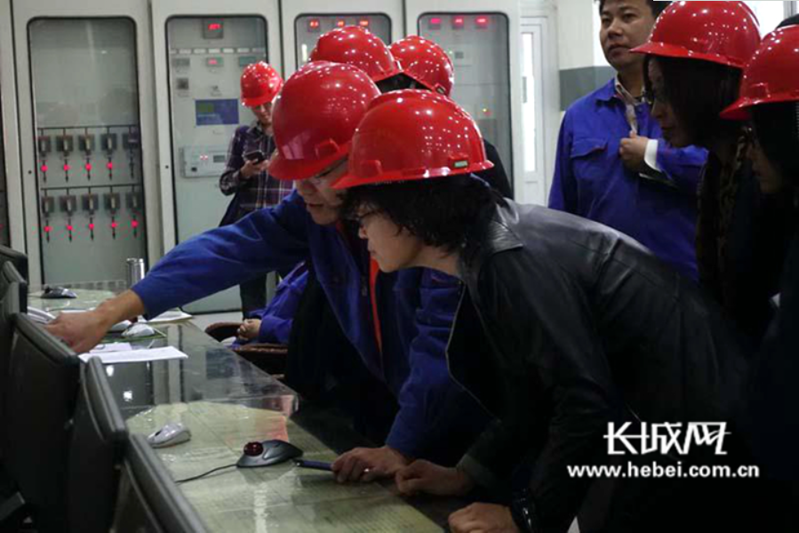 督导组在石家庄诚峰热电有限公司了解生产工艺勘察排污节点情况。河北省环保厅/供图