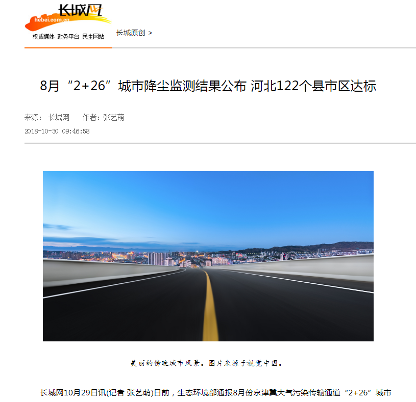 长城网:8月“2+26”城市降尘监测结果公布 河北122个县市区达标