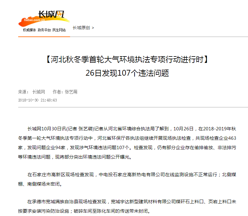 长城网:【河北秋冬季首轮大气环境执法专项行动进行时】26日发现107个违法问题