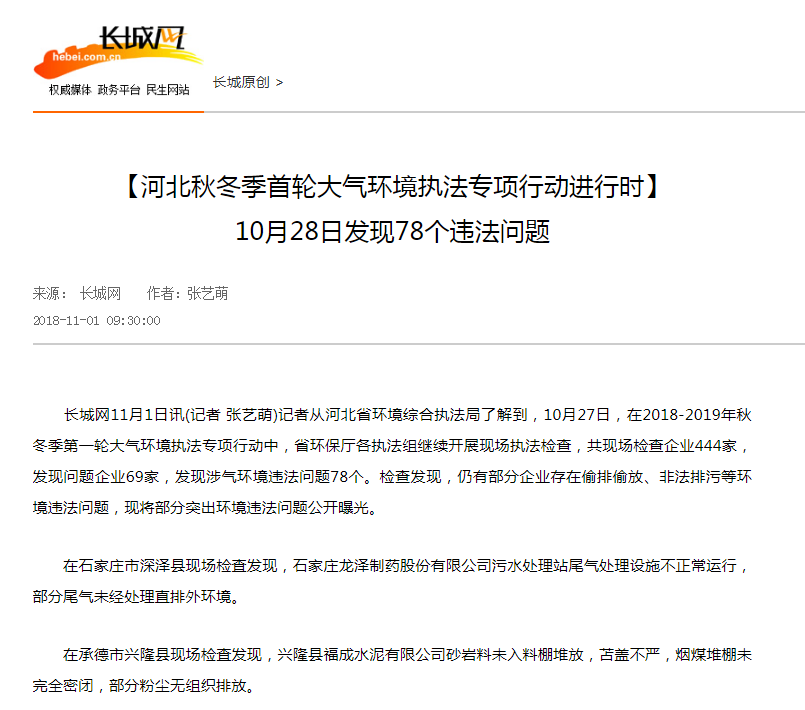 长城网:【河北秋冬季首轮大气环境执法专项行动进行时】10月28日发现78个违法问题