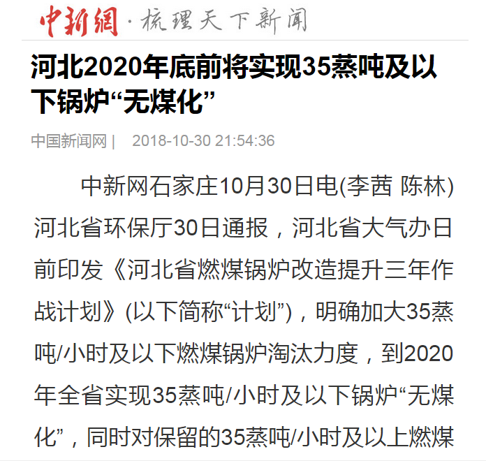 中国新闻网: 河北2020年底前将实现35蒸吨及以下锅炉“无煤化”