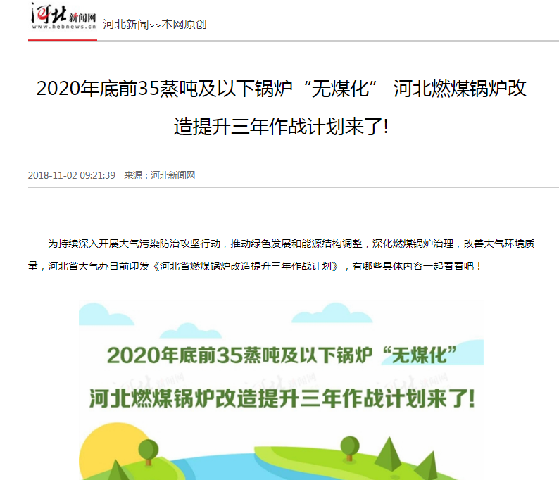 河北新闻网:2020年底前35蒸吨及以下锅炉“无煤化” 河北燃煤锅炉改造提升三年作战计划来了!
