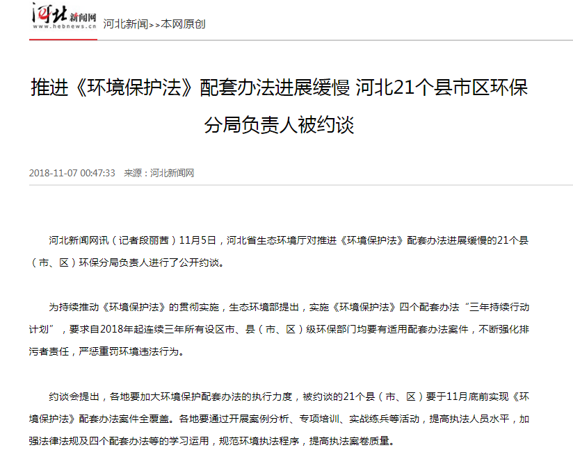 河北新闻网:推进《环境保护法》配套办法进展缓慢 河北21个县市区环保分局负责人被约谈