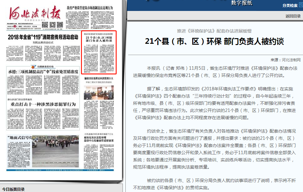 对推进《环境保护法》配套办法进展缓慢的保定市竞秀区等21个县(市、区)环保分局负责人进行了公开约谈。