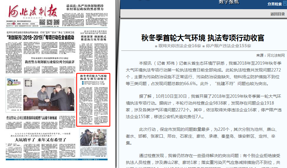 据了解,10月10日至30日,我省开展了2018年至2019年秋冬季第一轮大气环境执法专项行动。据统计,本轮行动共检查企业9838家,发现存在问题企业1918家,涉及各类涉气环境问题2272个。其中,依法取缔关停违法企业16家,停产限产违法企业155家,移送公安机关追究责任7人。