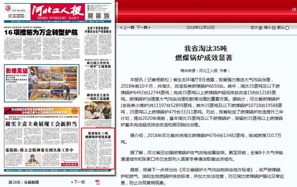据悉,我省下一步将出台《河北省锅炉大气污染物排放地方标准》,收严燃煤锅炉和燃气、油和生物质锅炉排放标准,并加大执法检查,对已淘汰燃煤锅炉强化日常巡查,防止出现复烧现象。