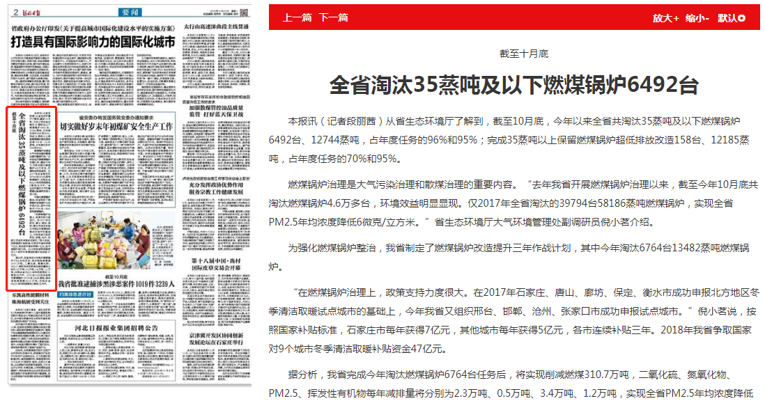 河北日报:全省淘汰35蒸吨及以下燃煤锅炉6492台