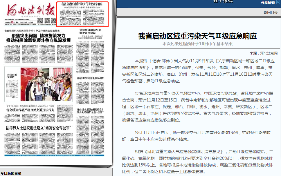 本报讯 (记者 郑伟)省大气办11月9日印发《关于启动区域一和区域二Ⅱ级应急响应的通知》,要求区域一的石家庄、保定、邢台、邯郸、衡水、定州、辛集、雄安新区和区域二的廊坊、唐山、沧州,发布11月11日18时至11月16日12时重污染天气橙色预警,启动Ⅱ级应急响应。