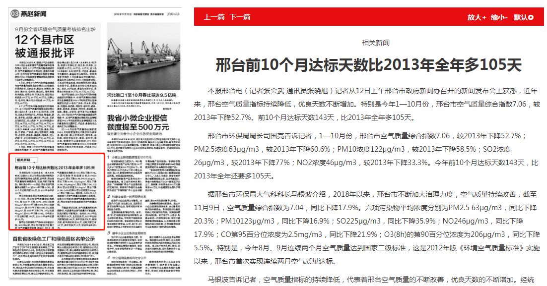 燕赵都市报:邢台前10个月达标天数比2013年全年多105天