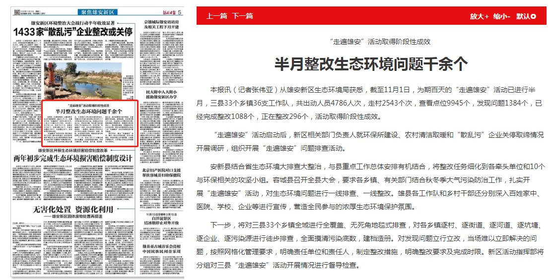 新区要求,通过“走遍雄安”活动,解决一批生态环境问题,改变污染现状,彻底改善生态环境质量,大幅提升管理水平,从思想认识到生态环境都有大的转变。